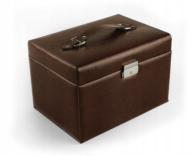 Коричнева скринька з відділеннями підійде для різних прикрас. Має відділення для кілець, намиста, підвісок і брошок або годинника. Зсередини вона обшита велюром, що запобігає появі подряпин на прикрасах. На внутрішній стороні кришки є дзеркало.